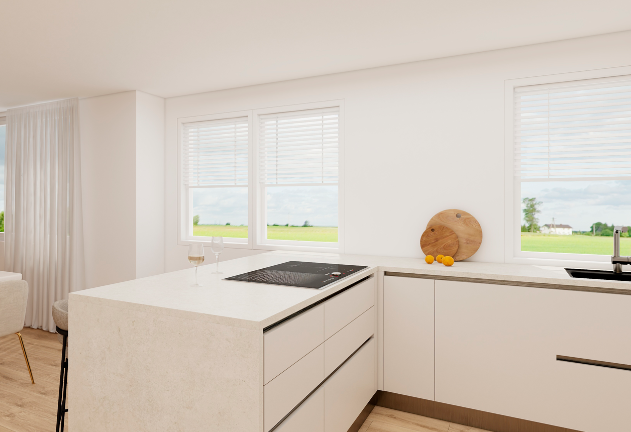 El programa funcional es completa amb una zona lineal d’armaris que concentra els electrodomèstics i l’emmagatzematge, resolta mitjançant una integració formal acurada per garantir la coherència estètica del conjunt. La pica s’orienta cap a l’exterior, cosa que permet aprofitar l’entrada de llum natural i millorant la qualitat ambiental i el confort durant l’ús diari.