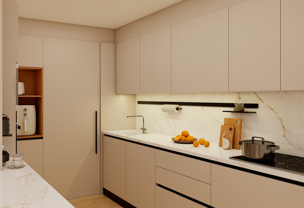 El mobiliari es resol amb línies netes i volums integrats, combinant tonalitats neutres amb acabats de fusta càlida i superfícies de marbre amb vetes daurades i grises sobre una base blanca, aportant equilibri i confort visual. Els electrodomèstics en columna s’integren de manera discreta dins del conjunt, garantint la funcionalitat sense interferir en la lectura formal de l’espai.